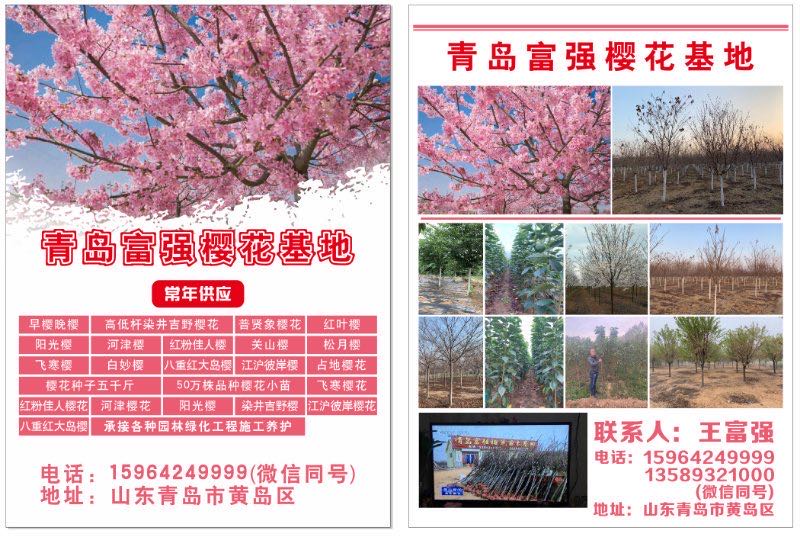 山東青島富強櫻花苗木基地歡迎您(王富強 13780680000、13589321000),青島富強品種櫻花基地常年供應(yīng):早櫻晚櫻,高低桿染井吉野櫻花,陽光櫻,河津櫻,紅粉佳人櫻,關(guān)山櫻,大漁櫻,松月櫻,飛寒櫻,白妙櫻,美利堅櫻,紅花染井吉野櫻,八重紅大島櫻,江滬彼岸櫻,小松乙女櫻,思川櫻,紅山櫻,雅櫻,獎?wù)聶眩酥丶t垂枝櫻等占地櫻花,承接各種園林綠化工程施工養(yǎng)護(hù)。歡迎新老客戶來我們這邊考察,購苗買苗服務(wù)。